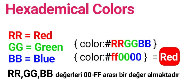 Hexadecimal renkler, RGB modeline dayanır. RGB’de olduğu gibi her renk üç kanaldan oluşur: