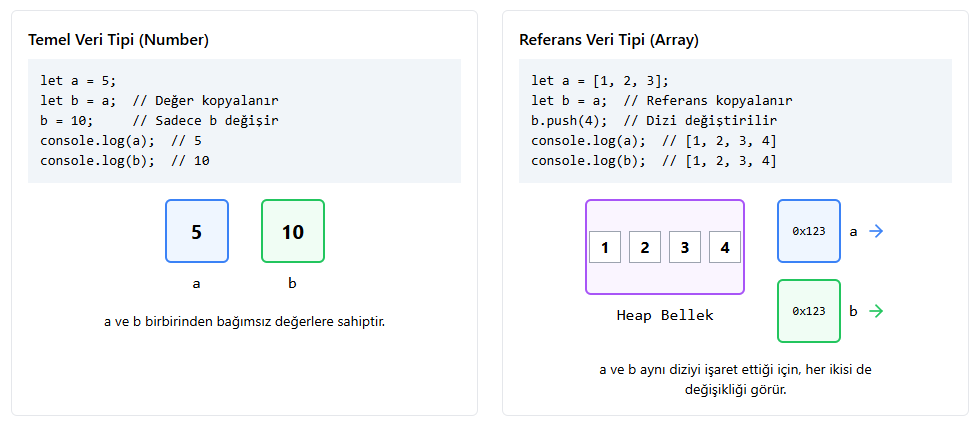 , doğrudan değeri yani 10’u bellekte tutar. Ama diziler gibi karmaşık yapılar doğrudan saklanmaz. Bunun yerine, JavaScript bellekte dizinin bulunduğu yeri, yani referansını saklar.